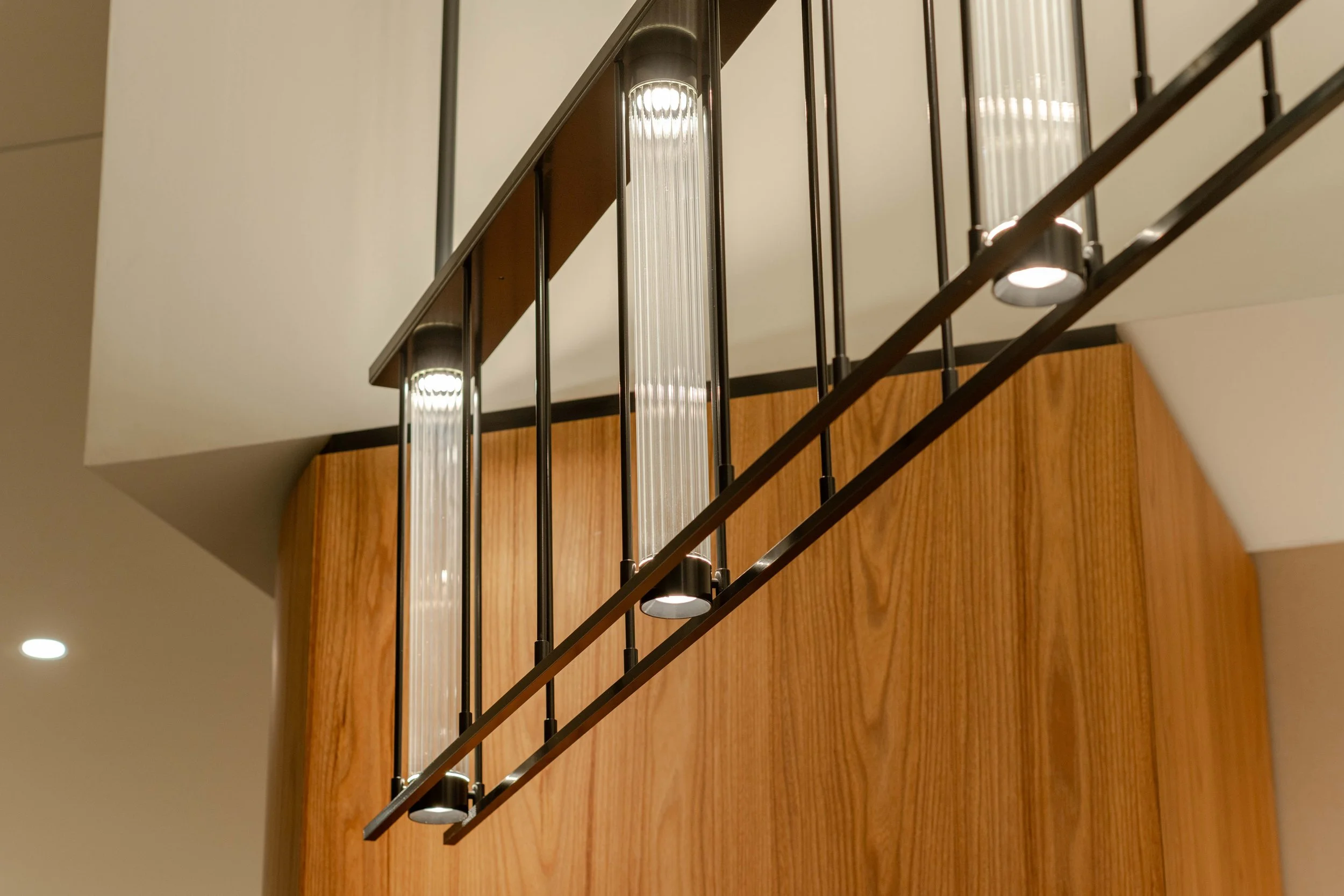 To complement the pendants, Optelma supplied its innovative Keno recessed LED spotlight system. Built into a refined frame system, Keno delivers seamless, flexible illumination with total precision — ensuring consistency and control while remaining discreet within the architecture.